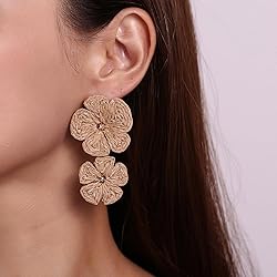 Boho Raffia Flower Earrings: These statement earrings are made of nature raffia, which is a popular element Floral Design: These delicate earrings are made up of two flowers on top and bottom in bright colors and are elegant and understated Handmade: These raffia flower earrings are hand-woven and handmade, so each pair is slightly different. Handmade, natural and chic are the main characteristics of our earrings Size and Weight: The size is about 6*3.5 cm/2.4*1.4 inch, and the weight is about 18.7 g/0.6 oz, lightweight and comfortable to wear Occasions: Our raffia flower earrings come in many colors, these earrings will be your good choice for spring and summer, whether traveling, partying or vacation
