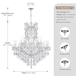 【Elegance K9 Crystal】:This maria theresa crystal chandelier is made of carefully selected high quality K9 crystal with crystal clarity. Whether the light is on or off, it produces a luxury effect and high light transmittance 【Adjustable Height】:This chandelier light fixture D35.4inch x H45.7inch. Consider of low and ceiling, we provide adjustable hanging chain(MAX. to 78.7"). Sloped ceiling also acceptable for this high ceiling chandelier 【24*E12 Bulbs】:This crystal chandeliers for dining room requires 24 x E12 bulbs(Bulbs are not included) Max 60W. Compatible with many kind bulbs: Dimmable Bulbs, Energy saving bulbs, Led Bulb,Halogen Bulbs etc 【Wide Application】:The large high ceiling crystal chandelier is a great choice for your living room, dining room, bedroom, kitchen, foyer or any other art deco place 【After Service】: If you have any question or suggestion after you receive the luxury chandelier, please check the installation guide first and also feel free to contact us via Amazon message, we are far more than happy to help
