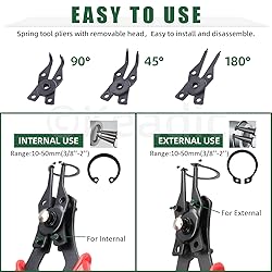 【Package Include】The 312pcs snap ring remover tool set contains 210pcs c-clips in 21 different sizes( M4, M5, M6, M7, M8, M10, M12, M14, M16, M18, M20, M22, M24, M26, M28), 100pcs e-clips in 10sizes (1.5mm, 2mm, 3mm, 4mm, 5mm, 6mm, 7mm, 8,mm, 9mm, 10mm), 1pc tweezers, 1pc snap ring pliers with 4 interchange heads (two 180 degree straight ends jaws, one 45 degree bend jaws, one 90 degree bend jaws), in total of 312pcs. Large quantities and various sizes can meet your daily needs. 【Quality Material】Our e-clips and c-clips are made of 65Mn metal steel, which have the feature of stronger mechanical properties, harden ability, good corrosion, tensile strength and heat resistance, allowing them to provide sufficient strength and stability when connecting and fixing pipes or other components. 304 stainless steel external retaining rings ensure a long time using in bad environment like high temperature, cold weather, and high humidity areas. 【4 in 1 Snap Ring Pliers】 We offer one snap ring pliers with 4 interchangeable head for ring from 3/8 to 2 inches, point to point length range of 10-15mm, which are reversible joints and reversible for both internal and external retaining rings. Just press the spring on the pliers head can you replace the most suitable pliers head to start the work. Equipped with cushioned insulated vinyl handles for a comfortable non-slip grip. Labor-saving spring for easy operation. 【Convenient to Use】These e-cilps and c-clips are convenient to use, you can use our included tweezers or snap ring pliers to clamp the spring and place clips in the shaft slot or hole slot of the machine or system you need to replace. With the help of tweezers or snap ring pliers, you can easily and accurately complete installation work, and save a lot of time. 【Wide Usage】The snap ring set serves a crucial function in the axial grooves of diverse machines and equipment, ensuring that the snap rings can fit tightly and provide stable fixation and connection effects. Ideal for cylinders, automobiles, motorcycle sprockets, radio-controlled (RC) cars, lawnmowers, valves, electrical appliances, spraying equipment, doors and windows, bearings, and general machinery.
