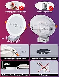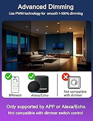 Alexa Voice Control (Hub Required) & BRmesh App Control: (No registration required, No 3rd-party account required) The iLC recessed lighting 6 inch is controllable via Alexa voice commands (with a Hub) and the BRmesh app for seamless smart home integration. Enjoy hands-free control or customize settings directly through the app without requiring an account. (Hub=Alexa Devices) Vibrant Color & Adjustable White Light: Featuring 16 million vibrant colors, adjustable white light from 2700K-6000K (warm to cool), and brightness levels ranging from 1%-100%, this led recessed lighting 6 inch transforms any room into a personalized ambiance. Ideal for living rooms, bedrooms, kitchens, and dining areas. Note: Dimmable via voice and app; not compatible with dimmer switches. Advanced Bluetooth Mesh Technology: Utilizing secure Bluetooth mesh networking, these 6 inch recessed lights operate independently of Wi-Fi or cloud services, ensuring local data safety and low-latency responsiveness. Sync multiple lights effortlessly for cohesive lighting experiences. Wi-Fi not supported. Smart Grouping & Scene Customization: Easily organize bulbs into groups like "Living Room" or "Kitchen" for synchronized control. With batch editing options, you can create dynamic scenes such as music sync modes, 25 preset dynamic patterns, and 9 DIY scenarios. Compact Design & Compatibility Note: Designed with a diameter of 6.77 inches and height of 1.26 inches, it fits perfectly into holes between Φ5.6 to Φ6.2 inches. Please note that these canless recessed lighting 6 inch are NOT compatible with traditional dimmer switches but offer advanced dimming via Alexa voice or the BRmesh app.