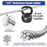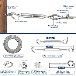 Complete 1/4 Wire Rope Kit: This all-in-one kit includes 50ft 1/4" stainless steel cable, 2 M8 turnbuckle hooks and eyes, 4 M8 screw eye bolt hooks, 4 M6 wire rope thimbles, 4 M6 wire rope clamps, and 10 M6 aluminum sleeves. Everything you need for heavy-duty installations 1/4 Stainless Steel Cable: Crafted from high-quality 304 stainless steel, this 1/4 steel cable offers exceptional corrosion resistance, durability, and strength. The 7x19 strand structure provides flexibility, with a safe load capacity of 1400 lbs and a breaking strength of 6400 lbs High-Performance Turnbuckles: M8 turnbuckles hooks and eyes offer easy tension adjustment and a secure grip, ideal for tightening wire ropes and hanging loads. Paired with M8 screw eye bolts, they provide strong, reliable anchor points for various applications Easy to Use and Install: The 1/4" stainless steel wire rope kit is thoughtfully assembled with all the essential components for various applications. Each part, from the sturdy wire rope to reliable hardware, ensures an efficient setup, making it perfect for both pros and DIYers Versatile Applications: This 1/4" aircraft cable kit is perfect for hanging heavy objects. Use it for anti-sag gate kits, marine rigging, boat lifts, winch cables, deck railing, securing cargo, awning hanging, sailboat fastening, zipline setups, and dog runs.