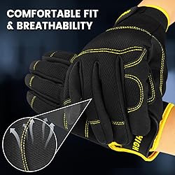 【Utility Work Gloves】 Synthetic leather palm provides rugged toughness and shrink resistance. Stretchable spandex back for enhanced dexterity and breathability. Touch screen fingertips make it capable for your phone or tablet without having to take the gloves off. 【Flexible and Comfortable】 Lightweight, breathable mens work gloves for all-day comfort. Exquisite using of meterial provides overall wear-resistance, grip and durability. Flexible, practical and snug-fit utility gloves give you more dexterity and finger control. 【Palm & Knuckles Protection】 Reinforced synthetic leather fingertips and palm patch with foam inside offers long-lasting durability, adds extra protection and resistance to wear. Foam knuckles for light impact protection. 【Easy On, Easy Off】 Adjustable hook & loop strips closure cuff provides a snug secure fit for ideal performance. Machine wash cool. Air drying is recommended in order to keep the size consistent with its original form. 【Wide Applications】 Best choice for everyday general purpose uses like regular construction, maintenance, mechanical work, logistic, warehousing, landscaping/gardening, hand tools, and DIY light duty works.