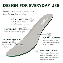 [Ultra Breathable] The thin shoe inserts upper is made of breathable mesh fabric and the bottom has ventilated holes, moisture wicking and breathing, comfortable and skin friendly, keeps feet dry and comfy all day long [Durable & Long-lasting]Soft insoles for women is made of high-density & lightweight material, odor eaters insoles for men, flexible and resilient, durable and not easily deformed, ensuring compression resistance and durability,Walking more comfort [Anti-Cushion & Slip On] U-type heel cup wraps around your foot, stabilizes the heel, shock absorbing cushion for maximum support. The texture on the bottom of the shoe insole increases anti-resistance, friction for maximum comfort and safety during wear [Compatibility] Memory foam shoe insoles come in a universal size design. In the back of the cushion insole have two cut lines, which can be cut according to your shoes and boots sizes. Comfort and cushioning for all types of leisure or daily footwear [Customer Care] Insoles for women standing all day can be used all year round and are easy to clean. Just contact us if there are any problems with the insoles and we are here to help