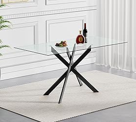 【Modern Glass Dining Table】Inspired by mid-century modern style, this glass dining table provides you a place to share meals with your loved ones. This tempered glass dining table is versatile enough to suit any style and complements any dining chair perfectly 【Selected High Quality Material】The top of our dining table is made of 0.31" thick clear tempered glass, stylish and beautiful, and provide an easy-to-clean surface for dining. The base is made of chrome plated metal, which is durable and provides stability support. The edge of the glass table is equipped with protective rubber pads to prevent children from being injured 【Stylish Design】Unlike other dining tables, our glass dining table is designed with four straight legs, they twist and overlap with a smooth metal finish, very stylish and suitable for the warm home of contemporary young people 【Multifunctional Glass Table】This glass table is perfect for kitchen dining table, coffee/coffee table, living room table, office desk. This compact piece is perfect for smaller spaces as it can accommodate 6 people, it's easy to install and less prone to damage 【Excellent Service】Product Dimension: W51.18"*D29.53"*H29.92",Net weight:52.8lbs,Weight capacity:180lbs. All parts included in the package are clearly marked. Using the step-by-step installation manual and each drill hole, you can easily assemble this dining table individually. Manual installation is recommended. If you have any questions, please contact us first.