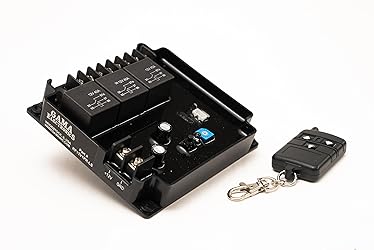 - RF Remote Control System, Reverse Polarity 12VDC Motor Control with Auxiliary Switch and Limit Switch Functionality. 12VDC Polarity Reversing R.F. Remote Control transmitter and receiver are designed for bi-directional control of DC motors. The output relays are rated at 30A @12VDC. This system is ideal for controlling gates, lifts, jacks, winches, slide-outs, awnings and agricultural applications where 12 VDC polarity reversing DC motors are used. The keyfob transmitter has three buttons. The left button runs the motor in one direction and right button runs the motor in the opposite direction. There are provisions for a manual switch that allow for an auxiliary On-Off-On switch to be connected. This permits operation of the control without using a transmitter. The control also has provisions for two normally closed limit switches. The control can be configured for either momentary or latching operation. In the momentary mode, the motor will operate as long as the buttons are held down. In the latching mode, pressing either button will start the motor and pressing the button a second time will stop the motor. The auxiliary switch leads only provide momentary operation. Loss of signal from a limit switch will also stop the motor in either mode. Current Detection/Over-Current System Shutdown. The RF12V1PR-LS incorporates output current detection that will disconnect the output when the output exceeds the current setting of the DIP switch. The DIP switch allows the user to set the current sensing level from 5A to 30A. When the current shutdown activates, the output is shutdown for 5 seconds. After the 5 second reset time the output can be activated by the pressing the corresponding switch on the transmitter. Light Output: A 3rd button on the transmitter is included for the 12VDC light output. The receiver electronics are encapsulated for waterproofing and it is suitable for use in harsh environments. Operating temperature range – 0° F to 160° F. The robust ABS enclosure dimensions are approximately 5″ L x 5″ W x 1″ H. Transmit range is greater than 100 feet under normal operating conditions. FCC Approved. Proudly made in the U.S.A.