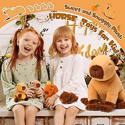 - Features: An educational toy: The cartoon capybara plushie doll includes 1 large capybara mother and 4 cute capybara babies. Let your children give full play to their imagination and creativity and make up some short stories about capybara mothers and capybara babies, suitable for tea parties and storytelling parties. Lovely gift: The capybara stuffed gifts are designed in a sitting position, come in large quantities and rich colors. You can give it to your children, family and more as holiday gifts for them to play with or decorate their rooms and more. Specifications: Material: short plush fabric Color: as the picture shows Size: Mom capybara: about 15.75 inches/ 40 cm Little capybara: about 3.94 inches/ 10 cm Package includes: 1 x Mommy capybara 4 x Baby capybaras Manual measurement, please allow slight errors on size. The color may exist a slight difference due to different screen displays. Suitable for people over 12 years old, and it's recommended to use under the supervision of adults in case of choking risk.