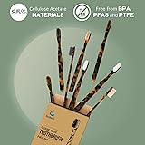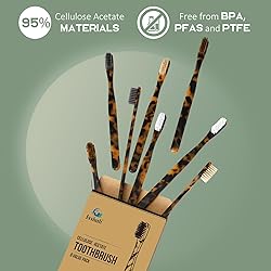 Sustainable Material - Our toothbrushes are made from cellulose acetate, a plant-based material derived from renewable resources, making them a sustainable choice for oral care. Gentle and Effective Cleaning - The toothbrush bristles are designed to effectively clean teeth and gums while being gentle on enamel and sensitive gums, providing a comfortable brushing experience. Ergonomic Design - Our toothbrushes feature an ergonomic handle design that fits comfortably in your hand, allowing for precise control and easy maneuverability during brushing. Durable and Long-lasting - The cellulose acetate material used in our toothbrushes is known for its durability, ensuring that they can withstand regular use and maintain their effectiveness over time. Stylish and Eco-Conscious - Our cellulose acetate toothbrushes not only promote sustainable oral care practices but also feature a stylish design that adds a touch of elegance to your daily routine.