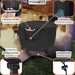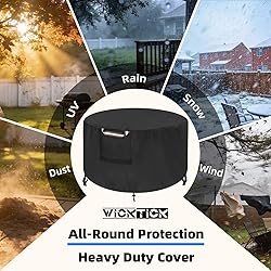 【 Fits Round Fire Tables up to 36" 】 Cover size is 36"Dia x 25"H, full protection for most 36", 35", 34", 33", 32", 31", 30" in Diameter and 25", 24", 23" 20" in Height gas / propane round fire tables or fire bowls 【 Adaptability 】 Compatible with Fire Sense, Hamtpon Bay, Bali Outdoors, Best Choice Products, Hiland, OutVue, Sunnydaze, Pleasant Hearth, Noble House, Pavestone, Senjoys, SUNBURY gas / propane fire pit Tables, etc 【 Waterproof PVC Lining 】 all of WICKTICK covers are lined with a premium PVC layer inside of the material, providing an impenetrable barrier against rainw and snow. This ensures your fire table / bowl being protected in harsh outdoor elements, whether it is in the patio, deck, porch, backyard or lawn 【 600D Heavy Duty Material 】 WICKTICK round fire pit table covers are crafted from top-tier 600D Polyester fabric, which significantly outperforms ordinary 420D/210D covers in terms of thickness, durability and rip resistance 【 Fade Resistant 】 WICKTICK fire pit covers have undergone special manufacturing processes that gives them excellent fade resistance. In most usage scenarios, our covers can maintain the color for 2 years without fading, which is much better than most other covers 【 Windproof Designs 】 Built-in 2 x Buckles and 1 x Drawstring, WICKTICK gas round firepit table cover could stay in place firmly on windy days, avoiding being blown away by winds 【 Package 】 Comes with 1 x Cover and 1 x Storage Bag