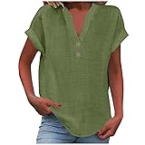 Generic Linen Shirts for Women 2024 Summer Short Cap Sleeve Half Button V Neck Tunic Tops Trendy Casual Cotton Lounge Blouses
