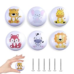 - Quantity and Size of Children's Drawer Handles: You will receive 6 pieces of drawer handles, each with a top diameter of approximately 1.5 inches. Additionally, you will get 6 screws, each about 1.1 inches long, designed specifically for dresser drawers. These handles are suitable for most furniture types. Please ensure to confirm your measurements before making a purchase to guarantee a perfect fit for your furniture. Durable Materials: These dresser knobs are crafted from high-quality ceramic, ensuring that the handles are secure and won't easily slip off. The sturdy and reliable construction makes them safe for use in any setting, providing you with both functionality and peace of mind.Easy Installation: These forest animal-themed dresser drawer handles are designed for quick and easy installation. Simply drill a hole in the desired location on your door panel, insert the screw through the panel, and tighten it into the handle. This straightforward process allows for hassle-free setup, making it easy for anyone to install these charming knobs.Unique Design: The children's cabinet knobs come in six different styles, each featuring an adorable wild animal print. The prints are securely adhered to ensure they won't easily come off, providing long-lasting charm. These knobs not only offer functionality but also cater to your need for personalization, adding a whimsical and unique touch to your furniture. Versatile Use: These woodland animal dresser knobs are the perfect decorative addition to your furniture. They can be used on cabinets, drawers, wardrobes, closets, nurseries, nightstands, and kitchen appliances. Moreover, replacing old knobs with these can breathe new life into your furniture, making even the oldest pieces feel fresh and new. Whether you're updating a nursery or revamping your kitchen, these knobs will enhance the aesthetic appeal of any space.