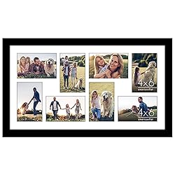 - Transform your home decor with the Americanflat 12x22 collage picture frame. This picture frame is made from engineered wood (MDF) in a classic black finish. Designed to showcase your most cherished memories, the 12x22 frame features a custom white mat, allowing you to display eight 4x6 photos or one 12x22 photo without the mat. Versatility is key with this gallery frame set as it comes equipped with hanging hardware for easy vertical or horizontal wall display, allowing you to effortlessly create your own gallery wall. The gallery style design seamlessly blend into any home decor, adding a touch of style to any space. Not just stylish, these black frames also offers premium quality and protection for your precious photos or artwork. The polished plexiglass front ensures clarity and protection against dust and scratches, while the sturdy backboard and simple turn buttons make photo loading a breeze. Choose Americanflat for all your framing needs. With our commitment to craftsmanship and protective packaging, you can be rest assured that your photo frame will arrive in pristine condition, ready to showcase your memories for years to come.