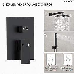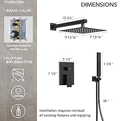 10 Inch Rainfall Shower Head: This ultra-thin overhead shower offers extensive coverage, allowing you to be fully enveloped in water. Enjoy a spa-like experience with the soothing sensation of a gentle downpour. The water distributes evenly across the 10-inch head, which is 360° adjustable, so you can set it to any desired angle for maximum comfort. High Quality 304 Stainless Steel: Stainless steel square rainfall shower head and solid brass shower valve construction. PBV (Pressure-balanced valve): Effectively prevents water hammer noise and scalding from abrupt temperature changes in hot or cold water. Flexible Hand Shower: With an extra-long 59-inch stretchable metal hose, this handheld spray allows you to clean specific areas that are hard to reach with an overhead rain shower, and you can use it to bathe children and pets or to clean the bathroom after a shower. Besides, the rain shower head with handheld spray comes with a silicone nozzle that wipes away mineral deposits with just a swipe of a finger. Important Purchase Note: Only for new and remodeled bathrooms, installation requires removal of tile/existing fixtures and repiping, please consult a plumber before purchasing