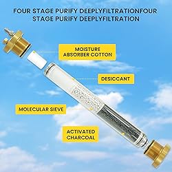 - 【Triple filtration material】TUDIVING pcp water oil separator contains three high-quality inner filtering materials:molecular sieve,desiccant,activated charcoal.It can better filter out impurities in the air, allowing you to breathe cleaner air, which is very suitable for diving enthusiasts.Equipped with explosion-proof valve, safer to use. 【Supernal Efficiency】Ultra-strong filtering of oil and water.Up to 99% of oil and water can be filtered out.More efficient filtration. 【Easy Installation】 The 2-head M10 * 1 female connector makes it easy for you to disassemble without wasting time; the 2-head M10 * 1 is the same as the new one for years; 【Strong Versatility】Compressor air filter available for all air pumps and pcp air compressors.The gas is fresh to make your diving more comfortable.perfect used for diving breathing,scuba cylinders,air guns and air rifles. 【Note】Don't take apart the High Pressure Air Filter, because disassembling it will make the Water-Oil Separator non-working.After the machine has finished the work, it is required to quickly loose the deflated screw to release air and oil-water mixture.