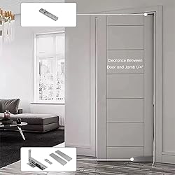 Spring loaded hinge for wood doors with self-closing and stop function and adjustable torque Wooden door requirements: thickness: 31.8 or 44.4mm, door weight less than 100 lbs.Clearance Between Door and Jamb1/4" Opening angle 0, 88, 116, can be opened in both directions, note that the door will spring back to its original position if not opened to a fixed angle, please be careful of rebound injuries. Indoor use, suitable for kitchen, hallway Package Includes: spring hinge x 1, 2 brushed side covers, 1 back cover, top hinge, screws, instructions