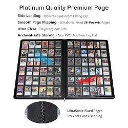 Max Storage: Large card binder holds 2304 trading cards, includes 36-pocket double sided black pages. Protect and showcase your trading & sports cards, post cards, memorabilia photos and documents with the highest standard in safe storage. Max Protection: Padded, extra rigid front and rear covers made from non-slip, water resistant material. Zippered closure to keep collectibles safe and intact at all times. Premium Pages: Double sided low-friction black backing, creating a separation between the front and back pockets, as well as providing cards a classic framed look. Side Loading: Designed to prevent cards from easily falling out, along with a zippered closure for extra protection. Wide Compatibility: Designed to fit a variety of sports cards and TCG cards. Compatible with all standard card protector sleeves.