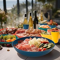 WHAT WILL YOU GET: 48-pcs wheat straw dinnerware sets include 9.5" dinner plates*8, 7.5" salad plates*8, 11" Fish Plate*8, 5.8" Bowl*8, 9.5" Pasta Bowl*8, 4.3" Cup*8. It's the perfect combination for a family dinner party and will fulfill all your kitchen needs ECO-FRIENDLY MATERIALS: The dinnerware set is made from natural organic wheat straw and food grade PP. 100% BPA free, gluten free, non-toxic, odorless, safe, eco-friendly and hygienic. Every purchase helps to avoid wasting and burning wheat straw, making the air fresher, and everyone's life more healthier LIGHTWEIGHT AND NON-BREAKABLE DISHES: Our dinnerware sets are designed to be space-saving with smooth rounded edges. They are all light to pick up and super sturdy, so they won't break even if you drop them on the floor! No more worrying about breaking, chipping or dropping heavy utensils, safe for kids and adults alike MULTIPLE USES: Perfect for parties, picnics, camping, and daily meals at home, school, office, outdoors, or traveling, all sizes are perfect for children or people of any age FREEZER & DISHWASHER SAFE: These dishes are dishwasher safe so cleanup is a breeze. They can also be used to store leftovers in the refrigerator. WARNING: Not recommended for microwave use