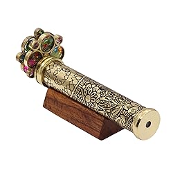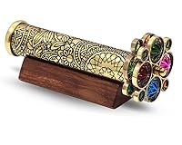 Floral Pattern- Carefully crafted with a acid-etched floral pattern, The black patina finish enchance brass natural beauty and highlighting the lacquered plated barrel's inherent beauty. Two Separate Turning Wheels- The two separate turning wheels are crafted from brass and filled with colorful glass beads, creating captivating patterns with each turn. Three Mirror System-The premium optical mirror within the three-mirror system generates a symmetry and an exquisite mandala. Exemplary Workmanship - Manufactured in INDIA with meticulous attention to detail and exceptional artistry. The elegant display Includes a hardwood base for stability and stylish presentation.