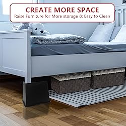 【WIDENED BED RISERS】: The upgraded furniture risers have an increased surface area to provide more contact with both the furniture and the risers, ensuring stable placement and accommodate overweight and oversized furniture (Width: 6.6"x4.1", Height: 6") 【UNIQUE L-SHAPE DESIGN】: The "L" shape of these risers makes it easy to match them with furniture legs. The half-wrapped edge design of the bed frame risers is suitable for furniture legs of various widths, especially furniture without legs or with thick legs. Offering more stability than ordinary models 【SOLID MATERIALS】: These furniture risers are made of premium quality plastic. Each bed riser can handle heavy-duty furniture weighing up to 6500 lbs. The bed risers heavy duty can carry the weight of bed raisers for dorm twin xl, king size bed, queen bed, etc 【MULTIPLE OCCASIONS】: These heavy-duty bed risers can be used to raise beds, sofas, couches, cabinets, tables, chairs, and fridges, providing you with more storage space and making cleaning more convenient.Also make it easier for elderly or tall person to get up from the couch and elevate a workbench to bid farewell to back pain, and even lift the head of bed to help nighttime reflux issues 【PACKAGE CONTENTS】: There are 8 sets in the box. Please note that due to the weight of the furniture, it is recommended to install the risers with the assistance of two people to ensure safety. Please check the size before purchasing the product