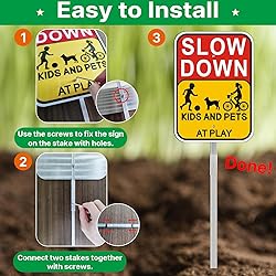 - Slow Down Kids and Pets at Play Signs with Metal Stake is made of Rust-Free Aluminum material. Let people know that there are children and pets playing here, and remind drivers to slow down. 14 x 10 Inches Ideal size,Bright colors and big enough to read from a distance. Kids at Play Sign is made of Sturdy and Durable Rust-Free Aluminum material, UV Protect, Reusable, Waterproof, No fading. Our Metal signs are professionally designed, not only with an eye-catching appearance but also with reflective materials that will catch someone's eye in the dark. Easy to let people see the important message. The package includes: Two Pack Slow Down Kids and Pets at Play Signs with Metal Stake.