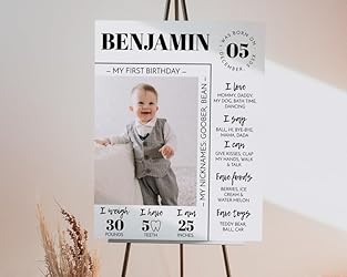 Generic Personalized First Birthday Milestone Poster, Modern 1St Birthday Milestone Sign, One Year Photo Baby Milestone Board, Design 012