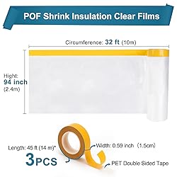 Package Contents: Window insulation kit comes with 1 roll of clear films 94 inch (2.4m) wide × 393 inch (10m) length, 3 rolls of 0.59 Inch (1.5cm) wide × 137 feet (42m) total double-sided tape and 1 installation manual. That insulates a total of 3 XL or patio windows or 6 large 4' x 6' windows. Heavy Duty Materials: The thickened shrink film is made of POF material, with durability, good transparency and good tenacity. The double-sided adhesive of PET is very adhesive, yellow backing paper is easy to tear, and can be adheres on painted or finished wood, aluminum, or vinyl. No residue when peeled off, removable and very easy to install. Window Insulation for Winter: This crystal clear film stops cold air coming in the room from leaky old windows when it is properly secured with provided double stick tape along window trim edges. Save on your energy bills and make a good choice for the environment, it has good transparency as well once warmed up with the hair dryer, will not affect the beautiful views from your windows. Roll-on Easier to Install: Get your scissors and hairdryer ahead of time, clean and dry the areas to be sealed. Measure and cut the films, tape attach it to the window frame, seal with the film and a little time with a hair dryer shrink all the wrinkles away. Please refer to the installation steps for the picture 6. Wide Application: The indoor and outdoor window insulator kit works well for most old drafty windows and doors, such as aluminum window frame, sliding window, basement window, attic fan cover, shutter covers, patio doors, french doors,etc.