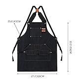 【HEAVY DUTY CANVAS APRON】Chef Apron handcrafted from 100% soft 16 OZ cotton canvas, no smell, environment protection. Exquisite hardware buckle. Large Pocket corners are reinforced with metal rivets, durable. It looks really stylish. 【ADJUSTABLE & REMOVABLE STRAP】Cross-back strap design, No more neck pains. We’ve designed ours with padded shoulder straps for even weight distribution and 1-click release buckles for easy wear. Extra long straps with quick release buckle accommodates wide range of sizing up to men's XXL sizes, you can adjust the length to fit you, soft and comfortable to wear. Mens apron, a quick release hardware buckle fastener, removable. 【PROVIDE FULL COVERAGE】27inches wide x 31 inches height for full coverage and unisex sizing. Large bib apron provides great coverage and protection from kitchen grease, marks, spills and food stains. 【MULTIPLE POCKETS】Bib Apron with Multipurpose pockets in the front design. Perfect to put your tools, cell phone, pens, notebook, grill slips, meat thermometer and others you need. Convenient for you to store gadgets. Two leather loops on chest design. The special loops prevent your headphone line from getting in the way of your work when talking on your mobile. High functionality, durability. 【WIDE RANGE OF USES】For professional and commercial use in daily life. Perfect for home, kitchen, restaurant, woodworking, salon, cosmetology, coffee shop, flower shop, bar, bistro, farmhouse, garden, etc. Can use as cooking apron, serving apron, nursing apron, baking apron, brewer apron, paint apron, BBQ apron, grilling apron, gardening apron, works apron, woodworking apron, welding apron, etc.