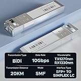 【BIDI Technology】- 10GBASE-BIDI Bidirectional SFP+ to single LC Optical transceiver module, Single Mode, Wave length: Up: TX1270nm/RX1330nm; Down: TX1330nm/RX1270nm, DDM, up to 20km over single LC. 【High performance】- Single mode BIDI 10 Gigabit SFP transceiver, supports up to 20km fiber length connection. NOTE: Use the same transceiver model in one fiber path connection, which can much improve reliability of data transmission. 【Plug and Play】- Easy installation, fully hot-pluggable with ESD protection. Widely used in network switch, server, or NIC with SFP+ to a 10 Gigabit fiber channel network with multimode LC for Network Attached Storage(NAS), Storage Area Network(SAN), and High Performance Computing(HPC) applications. 【Durable & Low Power Consumption】- Made of high quality alloy, the shell is strong and wear-resistant; Low power consumption(less than 1.05watt) and low EMI emission design. SFP MSA Compliant, IEEE 802.3ae Compliant. Operating Temperature: 0°C to 70°C. 【Wide Compatibility】- Compatible for Cisco SFP-10G-BX20D-I/SFP-10G-BX20U-I, Ubiquiti UniFi UACC-OM-SM-10G-S-2, Mikrotik and Other Open Switches. It is widely used in fiber, switches, routers, NIC,server or other fiber optic equipments with 10G SFP+ ports.