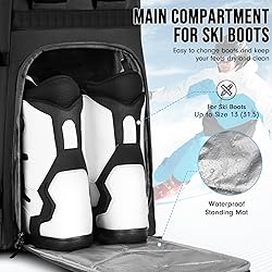 Large Capacity & Multiple Storage: Ski boot bag backpack measures 11.8"*13.7"*22", and possesses 65 liters of storage capacity; The ski gear bag comes with 8 compartments that keep all your gear in one: a main compartment for ski boots, an upper storage space for helmet, 1 top velvet room to protect your goggles from scratches, 2 front pockets to store your thick skiing jacket, pants, or gloves and socks, 2 side pockets for storing bottles or other stuff, 1 separate room for small items Boot Storage & Padded Back: Brand new geometric design YOREPEK snow ski bags fits up to US size 13 boot; The boot's storage lower part is made of a material that is similar to the indestructible and waterproofed tarpaulins, so the flap also acts as a stepping pad to keep your feet away from the snowy parking lot while changing out of boots on top; Thanks to equipped with nicely padded of backpack flap, the ski boot bag is comfortable to wear, and the ski boots don't stab you in the back Separate Wet & Dry: The snowboard gear bag exterior polyester material is waterproof and adequate thickness, and the interior nylon lining is also waterproof and durable; Ski bag and boot bag combo has all the usual compartments with different access points to keep all the mucky things separated from your nice while really to separate wet/dry, so put the wet dirty boots in the bag without messing up the trunk of your car since the waterproofed lining can be cleaned with a simple wipe Fasten Your Snowboard & Skis: Great for taking skiing or snowboarding; This snowboard boot bag has add 6 buckle straps in total that make it realized suitable for carrying two types of skis in one bag; Durable adjustable buckle straps on both sides and the back which can be used to fasten your downhill skis or snowboards to accommodate free-handed ski carry; When fully loaded, the ergonomic design including padded shoulder straps and a back panel enhances comfort during extended trips Friendly User Design: The backpack straps with reinforcement stitching is convenient for making it into the ski lodge; The addition of the waist belt and chest strap is adjustable to in optimal locations as it helps distribute the weight when fully loaded; The chest strap of this ski backpack has a lifesaving whistle that help in cases of an emergency; The waist belt of this ski bag for air travel comes with a sturdy large buckle, helping you make the skate bag fit you better by adjusting
