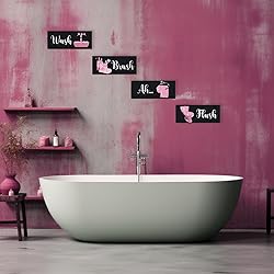 Black and pink bathroom decor set: you will receive 4 pieces of stylish pink bathroom wall art in different styles, beautiful and elegant, Adequate Quantity with an Exquisite Look can support your daily use and replacement needs, making leisure bathing time more enjoyable Funny pink decor theme: these funny pink bathroom decors are decorated with glitter pink color and bathroom element patterns, Like washbasins, toothbrushes, tissues, toilets, etc, and accompanied by text such as [Wash], [Brush], [Ah], [Flush], funny and noticeable; These pink bathroom accessories not only give you visual appeal but also create a fun and relaxed atmosphere Suitable Size and Quality Material: the elegant black and pink wall decor measures approx. 10 x 4 x 0.2 inches/ 25 x 10 x 0.5 cm, they are made of quality wood, smooth surface and not easy to break, suitable for hanging in most places without taking up too much space; you can use them for a long time as a beautiful home wall decor, making your home look cute and funny Easy to use: these glitter pink decors have hooks on the back for immediate hanging convenience, so you can stand them on a table or hang them on the wall; enough to complement any space. They offer an easy yet effective way to enhance the ambiance of your home bathroom decor. Funny and warm gifts: you can consider giving this pink wall decor to your friends, neighbors, or family, this funny pink and black bathroom decor is a nice gift for a birthday, Thanksgiving, housewarming, graduation, anniversary, Christmas, etc.
