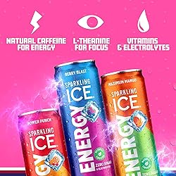 MAJOR FLAVOR: No one does flavor like Sparkling Ice. Get a boost of fruity, fizzy, taste-bud-tickling flavor in every sip. Variety pack includes a flavor ménage à trois of all three Energy flavors: Berry Blast, Maximum Mango, and Power Punch. NATURAL CAFFEINE BOOST: Supercharged with 160mg of natural caffeine, for a focused channel of energy to last you through the morning, midday, or night. ZERO SUGAR: We’ve never used it before and we aren’t about to start now. L-THEANINE FOR FOCUS: Ditch the jitters. Energy is loaded with L-Theanine, so you won’t just be caffeinated. You’ll be cool, calm, and collected too. VITAMINS + ELECTROLYTES: Sparkling Ice Energy contains vitamins B12, E, and plenty of electrolytes to keep you hydrated and happy. CALORIES THAT DON’T ADD UP: With zero carbs and only 10 calories per serving, Energy isn’t just guilt-free, it’s a much better option than soda or most other caffeinated drinks.