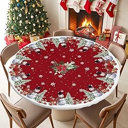 Round Fitted Tablecloth Elastic Edged Table Cover, Merry Christmas Tree Snowman on Red Waterproof Wipeable Table Cloths for Kitchen Dining Party Fit up 45-54in Tables, Poinsettia Floral Snowflake