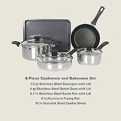 A SET INCLUDES: 9" frying pan, 1.5qt saucepan with lid, 8.7" sauté pan with lid, 4qt Dutch oven w/ lid, 15" cookie sheet, 6pc stainless steel cutlery set, nylon slotted turner, nylon spoon, nylon slotted spoon, whisk, grater, can opener, pair of tongs, bamboo turner, bamboo spoon, bottle opener, pizza cutter, silicone spatula, five measuring cups and spoons, four 10" opal glass dinner plates, four 8" opal glass salad plates four 6.5" opal glass bowls, four 11oz glass tumblers, five glass bowls w/ lids and 12-piece stainless steel flatware set. 74-PIECE KITCHEN IN A BOX SET: A complete collection of kitchen and tabletop pieces put together to help home cooks in every step of mealmaking and entertaining - from prepping, cooking and baking to serving and dining. STAINLESS STEEL COOKWARE: Three stainless steel cookware add a beautiful shine as an elegant accent to any kitchen or stovetop. Tempered glass lids offer visibility to monitor the food's cooking progress. Dishwasher safe. Safe on all cooktops, including induction stoves. ALUMINUM CONSTRUCTION: Made from durable aluminum, the frying pan distributes heat evenly for no-hotspot results. It features a nonstick interior for smooth food release and easy cleanup. Dishwasher safe, hand wash recommended. VERSATILE COOKIE SHEET: Perfect for baking pastries and roasting vegetables, the cookie sheet is any home chef's go-to companion for making appetizers, mains, desserts or sides. Hand wash only.