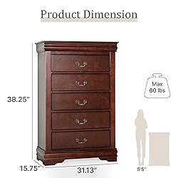 - Heritage Meets Modernity: 19th Century Romance in Modern Storage Transport your home to the romantic era of the 19th century with our Louis Philippe-style solid wood chest. Designed with timeless moulding that whispers tales of a bygone era, this wooden storage chest combines comfort, functionality, and the understated elegance of the period's furniture. The deep finish not only adds warmth to your space but also celebrates the quiet sophistication away from the ostentatious and overly ornate Imperial style. This clothes chest's a classic embodiment of history meeting modern living.Craftsmanship & Utility Our storage drawers are a testament to fine craftsmanship, ensuring both durability and an elegant joinery invisible from the outside. The antique-style nickel handles imbue traditional charm, subtly elevating the cherry chest dresser's visual appeal without overwhelming it. This multi-functional storage cabinet elegantly organizes attire in the bedroom, doubles as a chic decor cabinet in the living room, and neatly stows keys and clutter by the entryway, transforming any room into an organized, elegant space.Tailored for Lifestyle & Assurance As a versatile home decor storage option, this vertical chest of drawers serves as a toy chest, a treasure chest for your keepsakes, or a sophisticated clothes organizers and storage. It's a small space solution that delivers efficiency without compromising on style. With a one-year warranty and designed to be a key piece of your room furniture, it promises to play its role perfectly in every setting. Have a question or need assistance? Contact us before starting a return—we’re here to help! 📞 Customer Service: 888-980-5122 📧 Email: [email protected] We’re dedicated to finding the best solution for you!