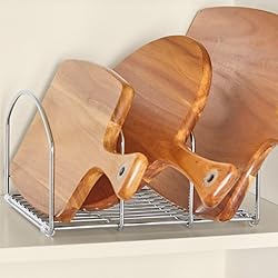 - Store your cutting boards and bakeware on this Chrome Cutting Board and Bakeware Organizer Rack for Cabinets and Cupboards for quick and easy access. The divided rack with 3 slots is ideal for use in your cabinet or pantry, or on a shelf or countertop. Easily grab what you need at any angle! Rubber grips on the bottom prevent scratching. Metal. Gently wash by hand. 8-1/2"W x 9-5/8"D x 5-5/8"H