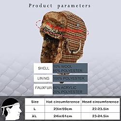 Shell: 90% polyester/10% wool. Lining:100% polyester. Interlining:100% polyester. Faux Fur: 100% polyester. Size: L / 59 cm / 23 in , fit head circumference 22 in-23.5 in. Our winter trapper hat is designed for both men and women, it can comfortably fit most head sizes and shapes, and are for all hair types. With classic design and high quality material, it can easily block wind and freezing gusts from attacking your face and neck. A chin strap secures the hat for improved warmth and fit. Very necessary accessories in cold winter. Perfect head gear for outdoor activities such as skiing,snowboarding,hiking,hunting,trapping and any more others. The hat is made using extra thick and soft faux fur combined with a layer of insulation. Guaranteed to keep your head warm in below zero conditions.