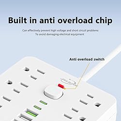 - JouleLoom 17-in-1 Surge Protector Power Strip, a compact and powerful solution for all your power and charging needs. Designed with versatility and convenience in mind, this surge protector with USB ports features a sleek, space-saving design measuring just 6.5" x 4.3" x 1", making it perfect for use at home, in the office, or on the go. The extension cord with multiple outlets comes with a generous 6 FT cable and a slim flat plug with a 45-degree right-angle design to ensure it won’t block neighboring outlets, making it ideal for tight spaces. This USB C power strip is equipped with 11 AC outlets, strategically spaced 1.2 inches apart to fit up to 17 plugs simultaneously. In addition to the AC outlets, it includes 4 USB-A ports and 2 USB-C ports, giving you the flexibility to charge multiple devices at once, including smartphones, tablets, and gaming consoles. The surge protector power strip integrates intelligent USB technology that adjusts power output for optimized and efficient charging, eliminating the need for bulky individual chargers. Safety is a top priority with the JouleLoom surge protector. It boasts an advanced 8-point safety system, including surge protection, overload protection, fire resistance, and temperature control, ensuring that your devices and home are protected. The power switch automatically trips in case of an overload, protecting your equipment and preventing damage. You can also reset it with a single press. This extension cord with USB ports is ETL certified for safety, giving you peace of mind during everyday use. The power strip surge protector with USB ports features two multi-directional hanging holes, making it easy to mount horizontally or vertically on walls, counters, or workstations, further enhancing its space-saving design. Whether you need a surge protector with USB-C ports or an extension cord with multiple outlets, the JouleLoom surge protector powerstrip is the ultimate choice for a clutter-free and efficient power management solution. With its combination of smart design, multiple charging options, and comprehensive safety features, this USB C power strip is an essential addition to any workspace or home setup.