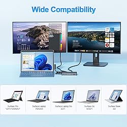 【Broad Compatibility with Surface Models】Equipped with USB-C or USB4 ports, Compatible with Surface Pro 12/11/10/9/8/X/7+/7, Surface Laptop 7/6/5/4/3, Surface Laptop Studio 2/1, Surface Laptop Go 3/2/1, Surface Go 4/3/2/1, and Surface Book 3/2. 【12-in-1 Thunderbolt 4 Docking Station】Optimized for USB4 devices, this versatile 12-in-1 USB-C/USB4 docking station expands your workspace with Dual HDMI (4K@60Hz), VGA (1080P@60Hz), 1000Mbps Ethernet, 2× USB-C data ports, 2× USB-A 3.0 ports, SD/TF card slots, a 3.5mm audio jack, and a 100W DC power input—providing simple and stable plug-and-play connectivity for daily work. 【Ultra HD 4K@60Hz output & Triple Displays Dock Hub】Triple Displays(4K@60Hz HDMI+HDMI+VAG) with extend or mirror mode, boost your efficiency 3 times, USB4 Dock Provide your devices with excellent 4K HDMI and VAG ports. 4K HDMI support resolutions up to 3840 x 2160@60Hz. VGA port supports display resolutions up to 1920 x 1080@60Hz. 【Super Speed Data Transfer Thunderbolt 4 Docking Station】This USB4 docking station comes with 2 usb 3.0 ports and 2 usb c port,the transfer speed of them are up to 5Gbps, allows you tranfer files in seconds from your usb flash driver, usb/usb c hard disks. In addition, The laptop docking station with SD and TF slots, you can transfer photos to your device with highest speed up to 5Gbsps. 【1000Mbps Ethernet + 100W DC Charging】The Gigabit RJ45 Ethernet port provides stable, high-speed wired network access for faster downloads and reduced latency. The 100W DC charging port ensures reliable power delivery to your device during multitasking and heavy workloads. (DC power adapter included.) 【3.5mm Audio Output Jack Port for Clear Sound 】Equipped with a 3.5mm audio jack, this dock allows you to enjoy music, multimedia playback, and wired headphones with smooth, high-quality audio output. 【What You Will Get】1x Thunderbolt 4 Dock,1x Power Supply Adapter, 1x instruction manual, and our 12-month worry-free service and warrant. If you have any questions, please feel free to contact us, we are here for you.
