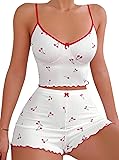FABRIC: This cute pajama sets for women is crafted from soft and stretchy fabric, super comfortable and skin friendly FEATURES: Sexy sleepwear for women, fruit pajamas, cherry print, bow tie, sleeveless, adjustable spaghetti straps, crop cami top and shorts set, slim fit, sexy lingerie, 2 piece lounge set DESIGN: This two piece pajama set for women featuring a v neckline, ribbed knit, fruit pattern, lettuce trim, contrast trim, elastic waistband, short length and a fitted silhouette, super flattering OCCASION: This summer pj sets for women is suitable for sleep wear, casual loungewear, and is also a perfect choice for wedding night, travel, vacation, holiday, bedroom, honeymoon, pajamas party, bridal gifts NOTE: To find your best fit, we recommend using the size chart of the last image before ordering