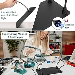 Super Magnetic Third Hand Soldering Tool: Helping hands soldering station frees up your hands and provides a 3rd hand where you need it. Our soldering tool boasts exceptionally strong magnetism, enabling the helping hand to remain firmly secured to the base, even when clamping heavy objects. Soldering tool is durable and works smarter. Perfect for engineers, artists or hobbyists working on projects that require extreme precision. Enhanced Insulated Alligator Clips: Stainless steel alligator clamps rotate 360 degrees for positioning and locking at any angle. The crocodile clips are fitted with an insulating rubber sleeve to avoid scratching the polished surface of your jewellery or shorting out circuit boards. Ideal for soldering tasks, assembly, circuit board holders, repairs, modelling, hobbies, jewellery and crafts! Flexible Metal Gooseneck: Soldering hands with 4 adjustable metal gooseneck arms, including two 12-inch and two 8.3-inch arms), the metal gooseneck can be easily positioned, stable and easy to hold at an angle without bouncing. The bottom of the gooseneck comes with a strong magnetic base that has a powerful attraction to the metal base. It ensures that your project stays put, thus guaranteeing accurate and stable work. Stable Powder Coated Metal Base: Rectangular steel base measures 9" x 5.91" and is rust proof and very sturdy. The base has 4 non-slip rubbers that prevent your soldering helping hands from sliding, shifting or tilting on the workbench. Protects your work surface from scratches, whether on the workbench、tabletop or desktop. Widely used: It can be used for electronic PCBs, wires, stained glass, arts and crafts, making DIY models of jewellery or other general purpose applications. The small helping hand soldering stand is a perfect gift for him/her. Our hassle-free after-sales support gives you peace of mind - please contact us for any questions or assistance.