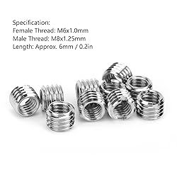 - Item Type: Thread Inserts Material: 303 Stainless steel Specification: Female thread M6x1.0mm, male thread M8x1.25mm, approx. 6mm / 0.2inlong Whether to Slot: There is a small slot Purpose: Thread repair Case: For example, if the M8 thread is slippery, if you want to continue to use the M8 thread after the restoration, use this method to first expand the M8 thread to the M10 thread, and then use the M8-M10-12 length reducer to change it back to M8, because the material of this reducer is stainless steel, it will make the M8 thread more firm Package List:10 x Thread Inserts