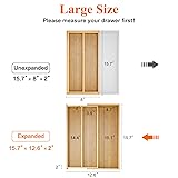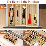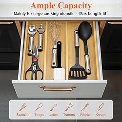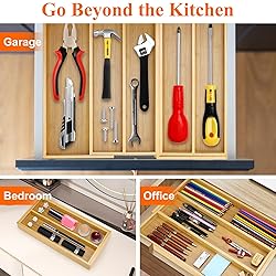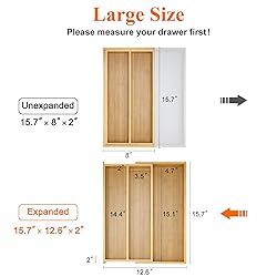 Expandable Design: The kitchen drawer organizer can be expanded from 8" to 12.6" in width, which provide 2~ 3 slots that will be fully stored in a variety of ways to maximize your space. It doesn't matter if you're trying to organize a small or large drawer; this utensil organizer is designed to fit. Ample Capacity: Featuring 2 large compartments and 1 expandable slots on the side, this utensil drawer organizer offers ample space for storing most cooking utensils in the kitchen, such as spatula, ladle, cooking spoon, tongs, utensil sets, and whisks. Makes the drawer look more put together and organized. Safe to Use: The bamboo silverware organizer is made of bamboo, which is friendly and organic, highly durable, and easy to clean. The construction means it is built to last for a long time. Multi-Functional Storage: This cutlery drawer organizer allows you to categorize your utensils, making it easy to access the items you need. It can also serve as a large flatware organizer, bathroom drawer organizer, or office drawer organizer for your office supplies, craft tools, makeup, jewelry, and more. Sort Your Silverware: With 2 different size options and a total of 3 compartments for easy sorting and storage. Keep clutter off of your kitchen counters and contain it all very neatly in drawers instead with one of these silverware tray.