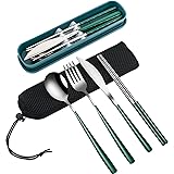 VANRA 4-Piece Portable Travel Utensils Set with Case 18/8 Stainless Steel Flatware Set Reusable Cutlery Set with Fork Spoon Knife Chopstick for Lunch Travel Camping School Work Picnic (Deep Green)