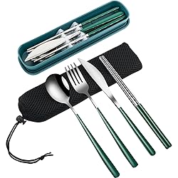 ESSENTIAL Utensils for Lunch Box with Chopsticks: With luxury mirror polished, adults travel flatware set is ideals for every daily lunch meals or eat on the go. Portable travel utensils set with case for school, office, trip, workplace, camping, outdoor picnic or work lunchboxes. CARRYING CASE and POUCH: Knife spoon fork and chopsticks stack together in the carrying case to minimize the storage space. The travel dinnerware set will fit perfectly into pocket, purse or lunch bag with protective pouch and storage case. THOUGHTFUL DESIGN: There is a fixed slot in the travel case to reduce collision and protect the silver tableware set for lunch box. Also reduce frictional noise when on the go. Storage box provides hygiene and health protection for the stainless steel flatware set. PREMIUM QUAILTY: Travel Camping Cutlery Set for men is made of heat-treated, durable food grade 18/8 stainless steel. Picnic flatware set with pouch is BPA FREE, NON-TOXIC PRODUCT. COMPLETED COMBO SET: Reusable utensils with case includes 1 dinner fork (8in), 1 dinner spoon (8in), 1 pair of chopsticks(8.2in), 1 dinner knife (8.6in), 1 plastic case and 1 travel pouch for home storage or travel use. Practical silverware set with case is perfect gifts to your friends or colleagues.