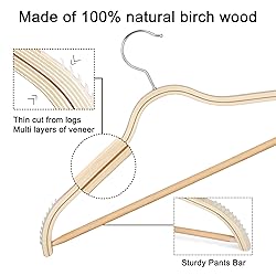 - TOPIA HANGER Slim Natural Wood Hangers 20 Packs with Extra Soft Rubber Grips, High-Grade Fashion Non-Slip & Wrinkles Hanger for Camisole, Sweater, Jacket, Dress, Coat Material:Solid Wood Color:Natural Pack:20 The Slim Natural Wood Hanger are made of natural solid wood with smooth finish.The wooden hangers are precisely polished by our experienced workers with great craftsmanship. All wood is sanded well and the wood is smooth finished covering the whole wooden hanger. Zero worry for any roughness of these wood hangers. "