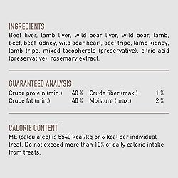 - Treat your dog with delicious and nutritious ORIJEN Freeze Dried REGIONAL RED Dog Treats. These ORIJEN dog treats are freeze dried to lock in the rich nutrients and taste, making them packable and perfect for adventures. At just 6 calories each, these treats are loaded with protein and amazing flavor. Containing 99 percent animal ingredients*, ORIJEN dog treats provide a high protein option for training or rewarding your dog. These high protein dog treats are made with high-quality animal ingredients, including beef liver, goat, wild boar and lamb, giving your dog an amazing taste! ORIJEN WholePrey ingredients including nourishing organs provide your dog with the most succulent and nutrient-rich parts of prey. *Approximate and derived from the unprocessed state of the ingredients.