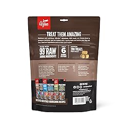 One (1) 8 oz bag of ORIJEN Freeze Dried REGIONAL RED Dog Treats ORIJEN high protein dog treats are freeze dried to lock in nutrients and flavor for a packable snack that's perfect for adventures Dog treat recipe containing up to 99 percent animal ingredients*, including WholePrey ingredients like nourishing organs to mimic what your dog's ancestors consumed in the wild Features high-quality animal ingredients, so your dog gets high protein dog treats with an amazing taste Freeze dried dog treats are made in the USA using quality ingredients from around the world