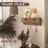 - Transform your house decor and apartment decor with this charming Farmhouse key holders with shelf Combo. This set includes two stylish and functional key holders designed to elevate your room decor aesthetic while keeping your essentials organized. The first piece features a key and mail holder with two spacious drawers, ideal for neatly storing keys, coins, and other small items. Its six sturdy hooks offer ample hanging space for your everyday essentials, while the top shelf keeps items securely in place. The second piece is a compact yet efficient cute key holder wall mount with a mini floating shelf and four robust hooks. Perfect for narrow spaces, this key wall holder seamlessly integrates into any room, adding a rustic touch to your decor. The extended hooks are perfect for a variety of items, from keys to coats. The key rack set is crafted from high-quality wood with a warm brown finish, making them a timeless addition to your farmhouse-inspired decor. Easy to install with included hardware, the mail organizer wall mounted is designed to support up to 22 pounds, ensuring a secure and stylish storage solution for your home. Upgrade your space with this delightful combo, perfect for adding both functionality and charm to your living area.