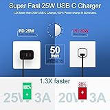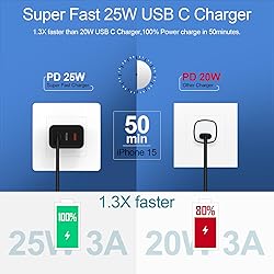 - 25W Dual 2 Port USB C Cell Phone Charger Power Adapter for iPhone,Samsung Galaxy Phones, Tablets, ect. 5.0X Faster Charging USB c fast wall charger plug provides max 25W output power, charging Samsung Galaxy S24 up to 60% in just 30 minutes, 100% charging about 0.8-1 hour. 25W samsung galaxy a15 5g charger fast charging cord quick charge up to 25W 3A, best matched 25W samsung galaxy a35 5g charger box. 25W double android charger fast charging block is total 25W 4.8A for charging 2 device. When only charging a USB C Port, the maximum speed is for 25W/3A. Or when charging 2 Port, the maximum speed is for 12W 2.4A. Compatible with: iPhone 16 Pro Max/16 Pro/16 Plus/16,15 Pro Max/15 Pro/15 Plus/15 Samsung Galaxy S26 Ultra S26+ S26,S25 Ultra S25+ S25,S24 FE,S24 Ultra S24+ S24,S23 Ultra S23+ S23,S22 S22+ S22 Ultra,S21 FE,S21 S21+ S21 Ultra 5G,S20 FE S20,S20 Plus,S20 Ultra,S10 Samsung Galaxy A17 A36 A26 A56 A16 5G A26 A36 A56 A15 5G A55 A35 A25 A14 A54 A24 A34,A23 A13 A33 A53 A52s A05s A03s,Z Fold 7 6 5 4, Z Flip 7 6 5 4 3,A52 A32 A72 A32 A12 Google Pixel 10 9a 9 Pro XL, 9 Pro, 9, 9 Pro Fold, 8a 8 Pro 8,Fold,7 Pro,7,7 Pro,6,6 Pro,5a,5 XL,5,4a, 4 XL,3a,3,3 XL,2 XL,2,XL PD 3.0 25W USB-C Power Adapter Input: AC 100-240V 50/60Hz 0.5A USB-C1/C2 Output: 5V-3A,9V-2.77A,12V-2.1A USB-C1+C2 Output: 5V-4.8A PPS: 3.3-5.9V-3A,3.3-11V-2.25A Power: 25W Max Material: PC fireproof shell Power: 25W / 3 Amps Package 1* 2 Port 25W USB C PD Fast Samsung A15 5G Charger Plug