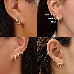 【GOLD PLATED HOOP EARRINGS DESIGN】: 4 pairs gold plated hoop earrings are designed to be comfortable and lightweight, with a clasp design, you can easily put them on and take them off, wearing them will make your ears more lovely 【 HUGGIE HOOP EARRINGS】: small gold hoop earring set is , no lead and no nickel with a delicate 14K gold-plated finish. You can comfortably wear them all day long, alone and stacked for everyday wear 【 EARRINGS SET SIZE】: Inner Diameter: 7 mm/7 mm/10 mm/12 mm. regular size and mini hoop earrings, easy to the beauty of layered earrings, suitable for most women's ears. Thick hoop earring set is perfect for multiple piercings 【GIFTS FOR LOVE】: Our cartilage hoop earrings come with a beautiful waterproof box, perfect gift for mom, friends and loved ones. The hoop earrings are perfect for parties, summer events, birthdays and daily matching 【CUSTOMER SERVICE】: We are dedicated to the stylish creation of necklace jewelry that fits into your everyday life. No matter you have any problems in wearing it, we will sincerely serve you. We will provide after-sale service at any time