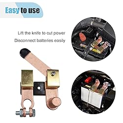 - The automotive top post blade battery switch is made of high-quality brass, with good wear resistance and electrical conductivity, safe use, thus making the product sturdy.Specification:Brand: BDZMCName: Car Top Post Knife Blade SwitchColor: GoldMaterial: BrassSize: 3.65 x 3.39 inchApplicable: Most vehiclesFeatures:-This top post battery disconnect switch kit is made of brass material, which provides strong conductivity, low resistance, and low energy consumption, thus increasing the efficiency of the circuit.-With this automotive blade cut-off switch, you can disconnect the switch in time to reduce power consumption and effectively protect equipment and personnel safety.-This top post battery disconnect switch is easy to use and can effectively save battery replacement costs.